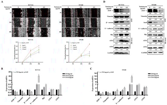 To further determine the sequential role of ER stress and EMT in CRC progression, we assessed the influence of ER stress on the motility of SW480 and HCT116 cells that were treated with a general ER stresser, tunicamycin (TM), and subjected to the wound healing assay. We found that the treatment group showed slower migration, which filled only half of the wound region 48 h after injury (Figure 3A). In keeping, qRT-PCR (Figure 3B,C) and Western blotting (Figure 3D) confirmed that TM treatment reduced the expression of ZEB1 and Vimentin and increased the expression of E-cadherin. As expected, TM treatment significantly increased the expression of ATF4 and Bip in these cells, although ATF6 expression was not affected to a substantial extent (Figure 3D). These results suggest that activated ATF4 signaling may be involved in inhibition of CRC motility and EMT.