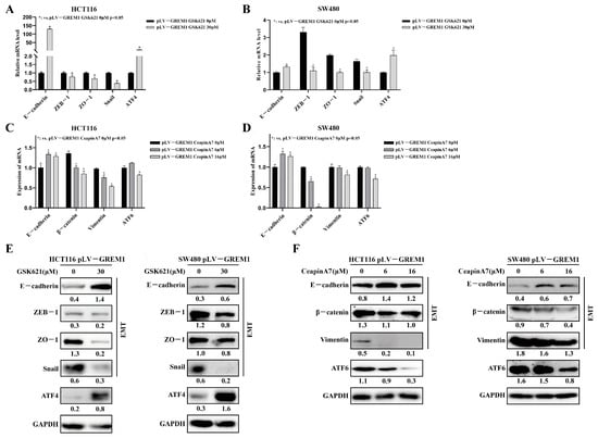 To further delineate the explicit arms of the UPR signaling that might be regulated by GREM1, we used our RNA-seq data to perform GSEA that presented negative regulation of PERK (NES = 1.6542, NP = 0.0000) but positive regulation of ATF6 signaling pathways (NES = 1.3553, NP = 0.0000) (Figure 4A). GSK621, a known AMPK activator, also induces PERK phosphorylation and activates the downstream eIF2α/ATF4 signaling pathway [45]. CeapinA7 is a selective blocker of ATF6α signaling in response to ER stress [46,47]. To gain insight into the underlying molecular mechanisms, we used the small molecules GSK621 and CeapinA7 to modulate the activity of these UPR pathways. GSK621 and CeapinA7 caused a significant reduction in cell invasion and migration detected by Transwell assay (Figure 4B) and wound healing assay (Figure 4C,D). Consistent with this result, the EMT-related genes (ZEB1, ZO-1 and Snail) were significantly downregulated, and E-cadherin was significantly upregulated in the GSK621 and CeapinA7 treatment group at both the mRNA (Figure 5A–D) and protein levels (Figure 5E,F), respectively, suggesting an EMT suppression role of these two compounds. These results collectively consolidate that ATF6 and ATF4 of the UPR pathways mediate the GREM1-induced CRC invasion and migration in vitro.