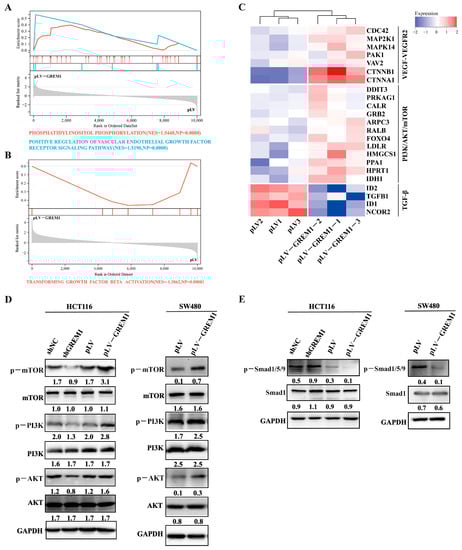 GREM1 is known as an antagonist of BMP2 to inhibit TGFβ/BMP signaling [48]. In contrast, activation of the BMP2 signaling pathway promotes the expression of ATF4 [49]. Hence, we postulated that overexpression of GREM1 in CRC cell lines would inhibit ATF4 expression by canonically suppressing the BMP2 signaling pathway. On the other hand, GREM1 was reported to non-canonically bind VEGFR2 and activate various intracellular effectors downstream [50]. The PI3K-AKT-mTOR axis, a classical downstream pathway of VEGF [51], could promote ATF6 expression [52]. We thus hypothesized that GREM1 might activate VEGFR2 and its downstream PI3K-AKT-mTOR axis to elevate ATF6 expression. In support, GSEA of our in-house RNA-seq dataset revealed the enrichment of the PI3K/AKT/mTOR, VEGF-VEGFR2 and TGFβ signaling pathways in HCT116 pLV-GREM1 cells (Figure 6A,B). In keeping, the heatmaps derived from the RNA-seq displayed that genes associated with VEGF/VEGFR2 and PI3K/AKT/mTOR signaling pathways, such as MAP2K1 (MEK1), MAPK14 (p38), CDC42, [51,53], FOXO4 [54], LDLR [55] and HPRT1 [56], were upregulated in response to GREM1 overexpression, whilst genes of the TGFβ signaling pathway were suppressed, such as ID1, ID2 and TGFB1 [57] (Figure 6C). Next, to validate these findings, we assessed the changes in protein expression levels of the key downstream molecules involved in these pathways by overexpression or knockdown of GREM1 in CRC cells. The results showed that overexpression of GREM1 promoted the activation of the PI3K/AKT/mTOR axis, downstream of the VEGF-VEGFR2 pathway, but impeded BMP-Smad1/5/9 signaling (Figure 6D,E). On the contrary, knockdown of GREM1 resulted in declined expression of phosphorylated PI3K, phosphorylated AKT and phosphorylated mTOR but in elevated expression of phosphorylated Smad1/5/9 (Figure 6D,E).