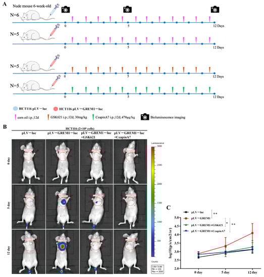 Animal experimental methods were approved by the Ethical Committee of Sun Yat-sen University (Institutional Animal Care and Use KY-2021-096-02). Six-week-old nude mice were purchased from Zhejiang Vital River Laboratory Animal Technology Co., Ltd. (Hangzhou, China). Mice were kept in specific pathogen-free conditions: 20–24 °C, 12/12 h of dark/light cycle, 60 ± 5% humidity and plastic cage (four mice/cage). HCT116 cells were stably transduced with a lentiviral overexpression vector encoding luciferase according to the manufacturer’s protocol (Shanghai Genechem Co., Ltd., Shanghai, China). Here, HCT116 pLV-GREM1-luc and HCT116 pLV-luc cells (2 × 106) were intravenously injected via mouse tails. GSK621 (30 mg/kg) and CeapinA7 (470 μg/kg) were injected intraperitoneally into the mice once daily, respectively, until day 12. Lung tumor colonization was observed by bioluminescence imaging on the 5th day and 12th day.