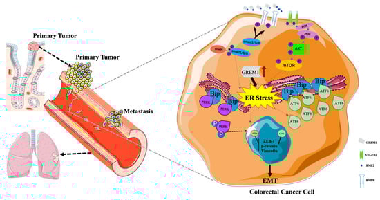 Mechanistic diagram of the role of GREM1 in ER stress, EMT and metastasis in CRC cells.