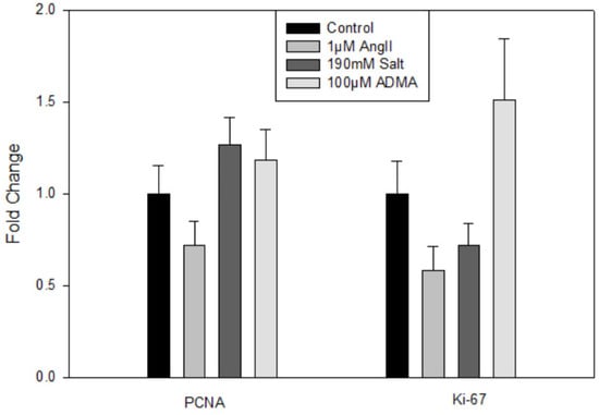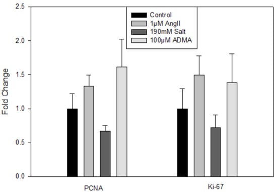 Treatment with HTN stimuli does not increase mLEC proliferation. mRNA expression of PCNA and Ki-67 in mLECs treated with saline, Ang II, salt, or ADMA. Results are expressed as mean + SEM (n = 7–13 independent experiments), and statistical analyses were performed with a one-way ANOVA.