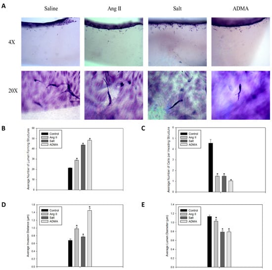 Treatment with HTN stimuli induced the formation of longer, thinner lymphatic vessels in hLECs. These figures show this with the inverse relationship between figures (B,D) and (C,E). Following the 24 h invasion assay, gels stained with toluidine blue were cut into 4–5 slices. Gels were imaged on their sides to allow for visualization of both the monolayer and the gel. (A) Images at 4× (invasion distance) and 20× (lumen diameter) were taken of LV sprouts in hLECs treated with saline, Ang II, salt, or ADMA. (B) The average number of lumen-forming structures (n = 150 or more), (C) average number of cells per invading structure (n = 187 or more), (D) average invasion distance (n = 475 or more), and (E) average lumen diameter (n = 150 or more) were quantified for all groups. Nuclei within sprouting vessels were counter-stained with DAPI to allow for quantification of the average number of cells per invading structure in each group. Invasion distance is defined as the minimum distance from the monolayer to the tip of the invading structure. The lumen of the vessel is defined as the clear space free of nuclei within a continuous membrane, which was visualized with the toluidine blue stain. ImageJ was used to measure the maximum width of the clear spaces. Results are expressed as mean + SEM, and statistical analyses were performed with a one-way ANOVA. * p < 0.05 vs. saline-treated cells.