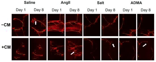 In the mesometrial vessels, treatment with HTN stimuli significantly decreased mesometrial lymphatic sprout length and sprout number (control sprout length in pixels by ImageJ analysis: 34.0 ± 2.6, Ang II: 3.7 ± 2.6, salt: 2.67 ± 2.18, ADMA: 9.06 ± 5.12, all p < 0.05; control sprout number: 7 ± 3, Ang II: 0 ± 0, salt: 0 ± 0, ADMA: 1 ± 1, all p < 0.05; Figure 4). Conditioned media treatment normalized sprout length and sprout number by Day 8 for Ang II and ADMA but not for salt (Figure 4).