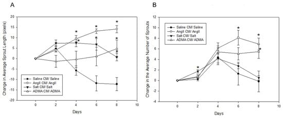 Treatment with HTN-stimuli-conditioned media attenuated the decrease in sprout length and sprout number (aside from salt) caused by direct treatment with HTN stimuli in murine mesometrium LVs. These delta figures combine the direct HTN stimuli treatment groups and the HTN-stimuli-conditioned media treatment groups in order to better visualize the attenuated decrease when compared to the saline control. (A) Average sprout length and (B) average sprout number, as rationalized in our previous publication [], in murine mesometrium explants treated with HTN stimuli in the presence and absence of conditioned media. Results are expressed as mean ± SEM, and statistical analyses were performed with a one-way ANOVA. * p < 0.05 vs. saline-treated LVs.