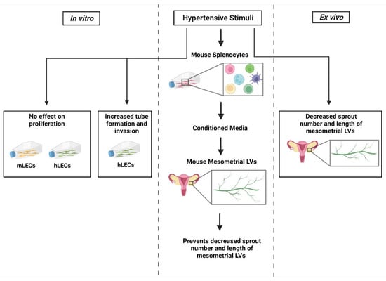 In conclusion, the main results of this study include that HTN stimuli have no direct effect on hLEC or mLEC proliferation but promote endothelial morphogenesis in the invasion assay (Figure 6). In the mesometrial LVs, HTN stimuli alone inhibited lymphangiogenesis, but that decrease was attenuated in the presence of conditioned media from HTN-stimuli-treated immune cells.