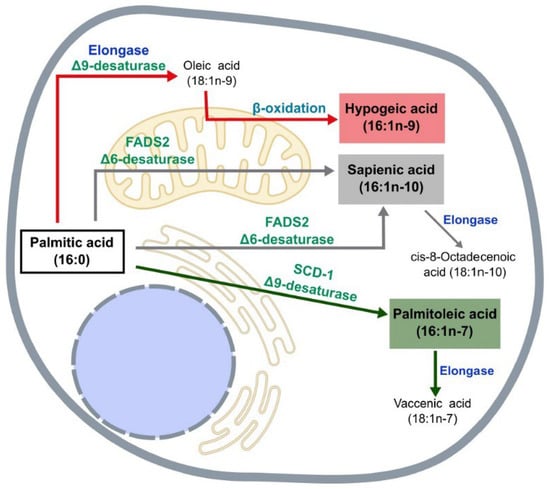Humans express three FADS genes, named FADS1, FADS2, and FADS3. FADS1 is known as a Δ5 desaturase, FADS2 is generally known as a Δ6 desaturase, and FADS3 as a ceramide desaturase [17]. Palmitic acid and the polyunsaturated fatty acids of the n-3 and n-6 series are competitors for the Δ6 desaturase reaction, which may limit the amount of 16:1n-10 produced by some cells [10,18]. It is striking that, while SCD-1-mediated Δ9 desaturation (leading to 16:1n-7 formation) takes place in the endoplasmic reticulum, FADS2-mediated Δ6 desaturation (leading to 16:1n-10 formation) also occurs in the mitochondria [19,20]. The later organelle is also the site of synthesis of 16:1n-9 via β-oxidation [9] (Figure 1). Clearly, compartmentalization of lipid synthesis, turnover and signaling must play a paramount role in regulating the metabolic and inflammatory reactions of cells and tissues [19,20,21]. In particular, the partition of palmitic acid between Δ9 (synthesis of palmitoleic acid) and Δ6 desaturase pathways (synthesis of sapienic acid) is beginning to be considered as a metabolic switch in health and disease [22,23].