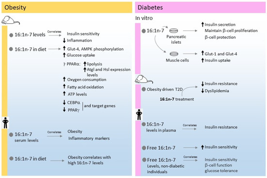 Summary of the effects of 16:1n-7 on metabolic and inflammatory conditions in obesity and diabetes.
