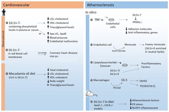 Currently, studies addressing the effects of 16:1n-7 on CVD remain inconclusive. In a cardiovascular health study (CHS) cohort, 16:1n-7-containing phospholipid levels in plasma have been associated with an increase in HDL-cholesterol, a reduction in LDL-cholesterol, but enhanced triacylglycerol levels [35,53]. Studies using diets supplemented with 16:1n-7-rich macadamia oil have shown decreases in total plasma cholesterol, LDL-cholesterol, and body weight, an increase in HDL-cholesterol levels, and no changes in triacylglycerol [60,61]. Conversely, elevated 16:1n-7 levels in serum have been associated in other studies with different cardiovascular risk factors such as high triacylglycerol, apoA-1, apoB, blood pressure and endothelial malfunctions [62,63]. Positive associations between red blood cell membrane 16:1n-7 levels and coronary heart disease risk have also been reported in another study, albeit in this case the levels of the 16:1n-7 elongation product vaccenic acid (18:1n-7) in red blood cells inversely correlated with disease risk [64].