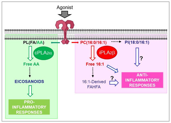 Exogenous administration of both 16:1n-7 and 16:1n-9 to animal models or to cell cultures has shown that both fatty acids manifest a marked anti-inflammatory character, being able to counteract the effects of a number of pro-inflammatory agonists such as bacterial lipopolysaccharide and yeast-derived zymosan particles [9,10,69,83]. While the molecular mechanisms involved are yet to be fully established, a major issue in this area is to define the mechanisms of regulation of 16:1 fatty acid levels and the pathways for incorporation and remodeling of the different lipid pools that contain them. Studies in macrophages have demonstrated that both 16:1n-7 and 16:1n-9 manifest a very strong propensity to incorporate into one single phospholipid species, namely PC(16:0/16:1) (1-palmitoyl-2-hexadecenoyl-sn-glycero-3-phosphocholine), which constitutes more than 80% of total incorporated fatty acid [10,84]. Upon cell activation both 16:1n-7 and 16:1n-9 are selectively mobilized from its phospholipid storage site by the action of group VIA calcium-independent phospholipase A2, or iPLA2β [84]. Of note, this phospholipase A2 is a different form from the one that effects arachidonic acid mobilization for eicosanoid biosynthesis, i.e., the group IVA calcium-dependent cytosolic enzyme, or cPLA2α [85,86]. Thus, inflammatory activation of macrophages activates parallel but independent metabolic pathways that result in the production of bioactive lipids under separate mechanisms of regulation [86,87] (Figure 4).