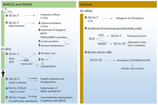 In humans, circulating levels of 16:1n-7 have been reported to correlate positively with the degree of hepatic steatosis, as well as with fat deposition in hepatocytes [25,42,53]. Indeed, an elevated 16:1n-7/16:0 ratio in serum was proposed as a non-invasive early marker for NASH or NAFLD [94]. The 16:1n-7/16:0 ratio was higher in NASH patients compared to NAFLD patients, and correlated with the hepatic inflammation and fibrosis status [94]. Similarly, a study with 41 Chinese pediatric patients aged 4 to 17 showed that serum 16:1n-7 concentrations were higher in the mild and severe groups of NAFLD compared with the control group [107]. Moreover, a study on the fatty acid profile of erythrocyte membranes of 55 adult patients with NAFLD who were subjected to a 6-month dietary intervention in order to reduce fatty liver, established that reduction of several fatty acids including 16:1n-7, directly correlated with liver metabolic improvement [108]. Figure 5 summarizes the effects of 16:1n-7 on NAFLD and NASH discussed in this section.