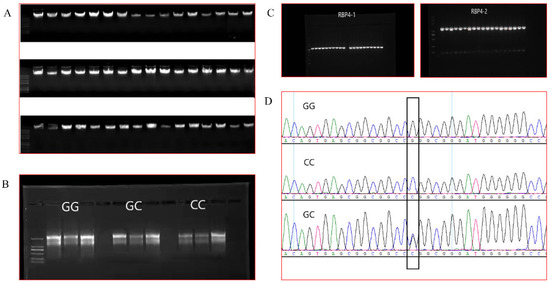 (A): Partial DNA electrophoresis results. (B): Electrophoresis results of total RNA from individuals of the three genotypes. (C): Electrophoresis results of PCR products. (D): Sequencing results for the RBP4 g.36491960G>C locus.