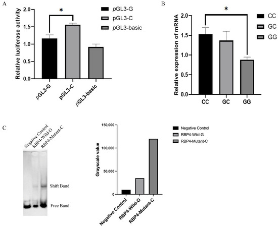 The g.36491960G>C mutation regulated the promoter activity of RBP4. (A): The result of the dual luciferase activity assay. (B): Expression levels of RBP4 in different genotypes. (C): EMSA of RBP4 individuals with different genotypes. The results were expressed as the mean ± SEM (n = 3). * p < 0.05.