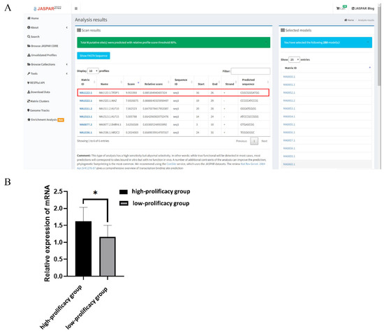 (A): RBP4 g.36491960G>C mutation binding transcription factor prediction (URLs https://jaspar.genereg.net/, accessed on 5 January 2022). (B): Expression of TFDP1 in ovarian tissues of Yunshang black goats in the high-prolificacy and low-prolificacy groups. The results were expressed as the mean ± SEM (n = 3). * p < 0.05.
