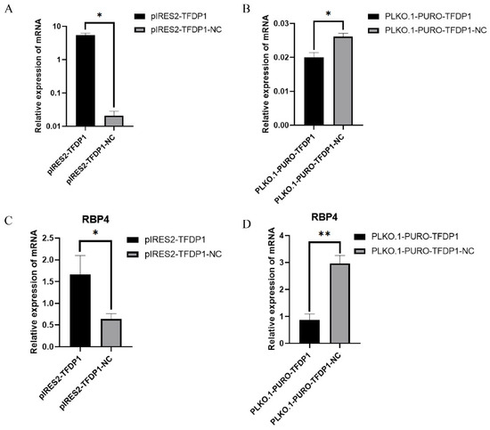 To verify the role of TFDP1 in regulating RBP4 expression, the plasmids pIRES2-TFDP1 and PLKO.1-PURO-TFDP1 were transfected into goat granulosa cells. The RT–qPCR results showed that TFDP1 expression levels were significantly increased or decreased after overexpression and interference with TFDP1, respectively, in goat granulosa cells (p < 0.05) (Figure 5A,B). The expression of RBP4 was significantly increased after overexpression of TFDP1 (p < 0.05) and significantly decreased after interference with TFDP1 (p < 0.01) (Figure 5C,D).