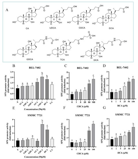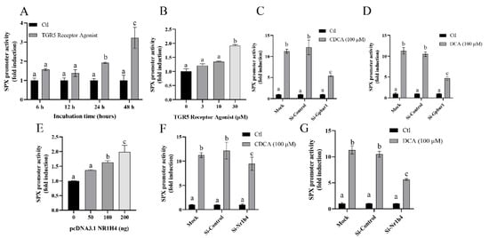 3.3. Bile Acid Receptor-Mediated CDCA- and DCA-Induced SPX Promoter Activity