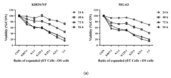 After PBMCs were cultured in EX media, CD3+γδTCR+Vγ9+ triple-positive γδ T cells were sorted by FACS, and the cytotoxicity and levels of secreted cytokines against OS cells were evaluated. OS cells were cultured with expanded γδ T cells at T/O ratios of 0.067:1–1:1 (expanded γδ T cells/OS cell ratios). Expanded γδ T cells showed increased cytotoxicity against the two OS cell lines in a ratio- and time-dependent manner. The cytotoxic effect of the expanded γδ T cells against KHOS/NP cells reached the highest level at 1:1 T/O ratios, and the viability of KHOS/NP cells decreased from 73.1% (24 h) to 23.1% (72 h) (Figure 3a).