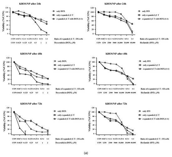 The IC50 values of DOX and IFO were evaluated after 72 h of incubation. For KHOS/NP cells, the IC50 of DOX and IFO were 0.15 and 11,746 μM, respectively. For MG-63 cells, IC50 values were 0.14 and 10,690 μM (Figure 4). KHOS/NP and MG-63 OS cells were co-cultured with expanded γδ T cells. After 24 h, the cells were treated with DOX or IFO, and cell viability was serially assessed at 24, 48, and 72 h.