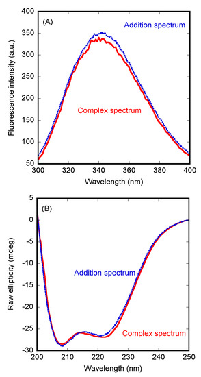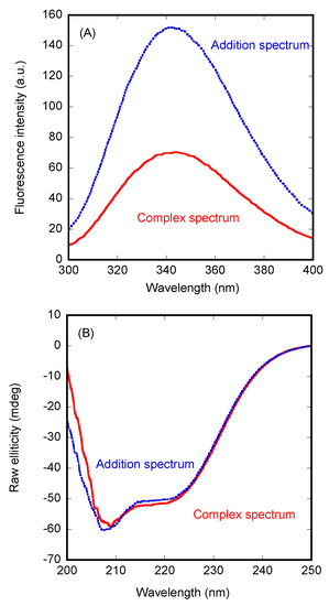 Isothermal wavelength spectra of each isolated macromolecule and that of the complex were acquired as an average of six scans, at a scan speed of 50 nm/min, with a response time of 2 s and a bandwidth of 1 nm. Handling and preparation of samples were the same described in Section 2.4.1.
