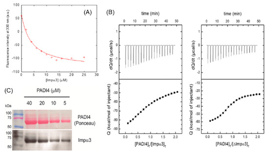 Since we observed changes in the fluorescence spectrum upon binding of PADI4 to Impα3 or ΔImpα3, we carried out titrations by keeping constant the concentration of PADI4 and increasing the concentration of the importin species. The results indicate (Figure 2A) that, for Impα3, the Kd was 3.9 ± 0.8 µM, whereas, for ΔImpα3 (Figure S1B), the Kd was 6 ± 1 µM, which are values quite comparable, within the fitting error.
