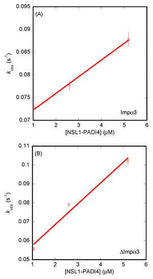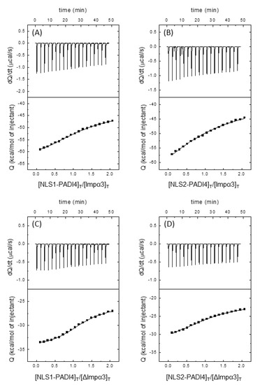 The calorimetric titrations with both peptides revealed that both polypeptide chains were capable of binding to both importins, Impα3 and ΔImpα3, with a favorable enthalpic contribution and an unfavorable entropic contribution to the Gibbs energy of binding, with NLS2 showing a more exothermic binding (Figure 6, Table 1). In both cases, we observed a single binding reaction, in contrast to what was found for other NLS peptides, where two transitions were observed and explained as due to the simultaneous binding to the major and minor binding sites of importin [77]. For NLS1-PADI4, the Kd values were 4.4 ± 4 µM for Impα3 and 1.5 ± 1 µM for ΔImpα3; for NLS2-PADI4, the Kd values were 23 ± 10 µM for Impα3 and 4.3 ± 4 µM for ΔImpα3. Thus, NLS1-PADI4 showed a slightly higher affinity, compared to NLS2-PADI4, for both importins, and ΔImpα3 showed a slightly higher affinity, compared to Impα3, for NLS1/2-PADI4.