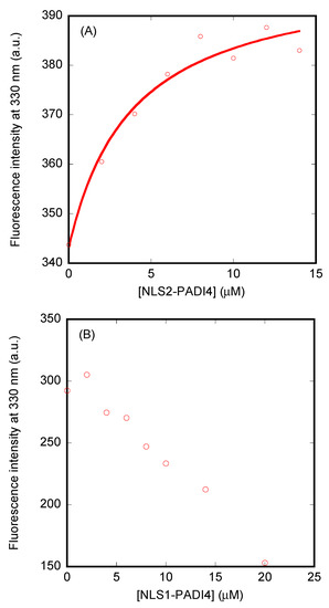 Polypeptide samples were excited either at 280 or 295 nm (although NLS2-PADI4 has only a single tyrosine). The other experimental parameters used in the experiments have been described elsewhere [48]. Appropriate blank corrections were made in all spectra.