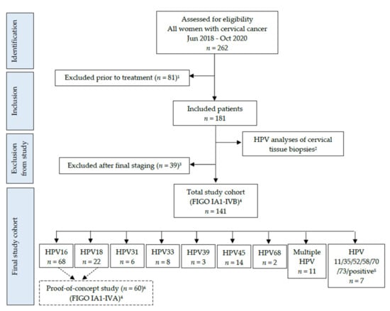 This proof-of-concept study is the initial part of a large setup, where all patients diagnosed with cervical cancer between June 2018 and October 2020 at Aarhus University Hospital or between January 2019 and January 2020 at Odense University Hospital were invited to participate (Figure 1). The inclusion criteria for the overall study cohort were as follows: patients ≥ 18 years of age diagnosed at Aarhus or Odense University Hospital with primary cervical cancer, FIGO stage ≥ IB1, and referral to curatively intended treatment. When the study was initiated, staging of cervical cancer was performed with FIGO 2009 classification [], but from 1 January 2020, staging of cervical cancer in Denmark switched to the FIGO 2018 classification []. Thus, to ensure that our study cohort was staged with the same classification system, patients included in 2018 and 2019 with FIGO 2009 were “re-staged” with FIGO 2018, and some were therefore “down-staged” from stage IB to stage IA. The rationale behind not including patients with <stage IB1 was that the great majority of these patients are cured after their surgical procedure, and thus, in Denmark, these patients are not offered a follow-up program for two years at the hospital. Since we planned to collect blood samples from all patients both before, during, and after treatment for up to two years after their diagnosis, this criterion was chosen as a cutoff. However, for patients that were down-staged from stage IB with FIGO 2009 to stage IA with FIGO 2018, these were treated and followed according to their initial staging (FIGO 2009) with a two-year follow-up program, and therefore, these were not excluded from the study cohort. The exclusion criteria were as follows: patients with relapse of a prior cervical cancer, FIGO stage < IB1 (until December 2019 with FIGO 2009) [], and from January 2020 with FIGO 2018 []), and referral to palliative treatment. Furthermore, patients whose cervical biopsies were tested HPV negative were excluded.