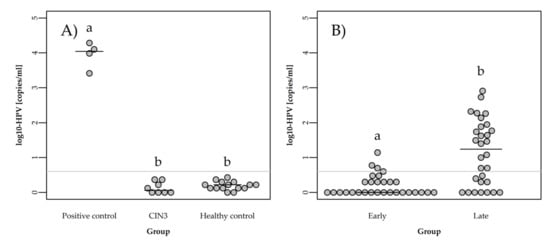 Detection of ccfHPV16/18 DNA by ddPCR in (A) four cervical cancer tissue samples (po-sitive control), eight plasma samples from CIN3 patients (CIN3), and 15 plasma samples from healthy individuals (negative control), and in (B) plasma samples from the early stage and the late-stage subgroup, respectively. Grey line represents cutoff value for HPV positivity (<3 copies/mL). Different letter (a,b) denote statistically different groups. Black lines represent median values.