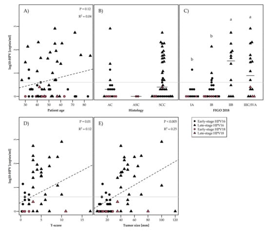 Concentration (copies/mL) of ccfHPV DNA (log scale) detected by ddPCR in cervical cancer patients according to clinical and biological criteria. Statistical significance was tested using the Kruskall–Wallis test followed by Conover–Iman for (B,C) and linear regression for (A,D,E). Grey line represents cutoff value for ccfHPV DNA positivity (>3 copies/mL). In (C), different letters (a,b) denote statistical difference between two groups, whereas the same letters (a, a or b, b) denote no statistical difference between two groups. In (B,C), black lines represent median values. (A) Concentration by patient age. (B) Concentration by histology (AC = adenocarcinomas, ASC = adenosquamous carcinoma, SCC = squamous cell carcinoma). (C): Concentration by FIGO 2018 stage (IA = IA1 and IA2, IB = IB1, IB2, and IB3, and IIIC/IVA = IIIC1, IIIC2, and IVA). (D) Concentration by tumor score (T score)1. (E) Concentration by tumor size (mm). T score was evaluated with the TS system presented in Table 1 in Lindegaard, J.C., et al. (see ref []).