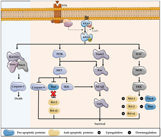 As a member of the human RAS family, the KRAS oncogene can modulate apoptosis, through the regulation of the downstream effector pathways. The regulation of apoptosis via RAS proteins results in cell survival, mainly through the activation of the PI3K pathway. RAS can bind to and activate PI3K, resulting in AKT activation. AKT is responsible for the phosphorylation of many substrates involved in the regulation of apoptosis. This protein leads to the inhibition of Bad, a pro-apoptotic protein from the Bcl-2 family, preventing the inhibition of the anti-apoptotic proteins Bcl-2 and Bcl-xL [12,59,60]. The activity of caspase 9 and the forkhead-box transcription factors (Fox) are equally inhibited by AKT, resulting in survival. Furthermore, PI3K can activate Rac, which consequently activates another essential transcription factor, the Nuclear Factor-kB (NF-kB). This factor is involved in the production of survival signals, as it promotes the transcription of several anti-apoptotic genes, including inhibitors of apoptotic proteins (IAPs). In addition, Rac can be activated and lead to the activation of NF-kB through Tiam 1, and AKT can phosphorylate and activate the IkB kinase (IKK), thus stimulating NF-kB [59,61,62]. Furthermore, the induction of the MAPK pathway contributes to the control of apoptosis, mostly converging to the same targets as the PI3K pathway [12,59]. Through MEK activity, RAS leads to a downregulation of Par-4, a pro-apoptotic protein [63]. This pathway can also modulate the expression levels of manifold proteins that belong to the Bcl-2 family, leading to the downregulation of the pro-apoptotic member Bim, and to the upregulation of anti-apoptotic proteins, including Bcl-2, Mcl-1 and Bcl-xL [58,64,65,66]. To help the escaping apoptosis, RAS interacts with Bcl-2, one of the best described RAS effectors, resulting in the upregulation of this anti-apoptotic protein (Figure 2) [67].