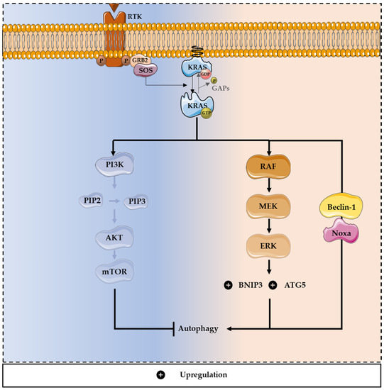 Despite the well-recognized importance of KRAS in cancer and the extensive efforts to develop therapies against its mutant, KRAS has been considered to be undruggable [32,123]. Firstly, KRAS mutations were identified as a predictive biomarker for anti-EGFR therapy inefficacy [123,124]. Although EGFR antibodies bind to EGFR with high specificity, mutations in downstream cascade, including KRAS, lead to the constitutive activation of the intracellular signaling pathway, independently of the stimulation via EGFR. Thus, in such a situation, it is redundant to inhibit this receptor [124,125]. Nevertheless, EGFR stimulates the PI3K pathway, leading to autophagy inhibition. Therefore, anti-EGFR therapy can induce autophagy. Panitumumab was reported to increase Beclin-1 protein levels, which probably constitutes a protective mechanism. Patients treated with cetuximab present increased levels of autophagy-related proteins. Moreover, autophagy activation through anti-EGFR agents can be related to a cytoprotective role in solid tumors and several cancer cell lines [126,127,128].