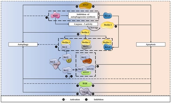 The apoptosis/autophagy regulation loop. There are several apoptosis regulators that are also involved in the control of autophagy and both processes are often activated together to respond to stress stimuli. These interactions can result in both inhibition and induction of autophagy. To inhibit the autophagic process, Beclin-1 can bind to Bcl-2, Bcl-xL and Mcl-1. In contrast, under nutrient starvation conditions, Bcl-2 is prevented in binding to Beclin-1, after being phosphorylated by JNK1, allowing the initiation of autophagosomes formation. Furthermore, BAX can lead to Beclin-1 cleavage, which is dependent on caspase-3 activity. This pro-apoptotic protein can also inhibit the autophagosome synthesis, a process that can be reverted by Bcl-xL. In addition, activators of apoptosis, including TRAIL, can regulate autophagy, having a positive influence on this mechanism. Regarding apoptosis induction, calpain-cleaved ATG5 and Bcl-2 interaction facilitates this programmed cell death process. Moreover, ATG7 expression leads to autophagy induction, caspase activation and increased cell death. The conjugation ATG12-ATG3 can also regulate apoptosis, as its disruption may result in increased Bcl-2 expression and decreased apoptotic cell death.