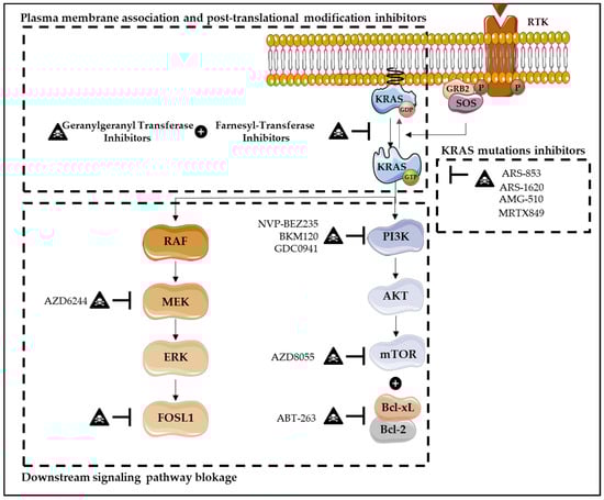 Therapies targeting KRAS-induced cell death resistance. Several therapies have been developed in order to target KRAS, including downstream signaling pathways blockade, direct KRAS inhibitors, KRAS plasma membrane association inhibitors and post-translational modifications. Downstream signaling pathways blockade, in particular MAPK and PI3K pathways, has also been explored. The inhibition of the downstream transcription factor FOSL1 seems to be a promise target in KRAS mutant lung and pancreatic cancers. Additionally, the inhibition of mTOR, AZD8055, combined with the dual BCL-XL/BCL-2 inhibitor, ABT-263, has demonstrated promising results. This approach induces robust apoptosis in KRAS mutant human CRC cells, but not in KRAS wild-type CRC models. In CRC cells, targeting PI3K/mTOR signaling, through its inhibitor NVP-BEZ235, also seems to be an effective strategy, as it induces growth inhibition and apoptosis. Similarly, in pancreatic ductal adenocarcinoma, combining MEK inhibitors, such as AZD6244, with the PI3K inhibitors BKM120 or GDC0941 results in increased apoptosis. Regarding direct KRAS inhibitors, these are one of the most promising strategies, in which KRAS-GDP state is favored over KRAS-GTP binding. Several inhibitors have already been developed, such as ARS-853, ARS-1620, AMG-510 and MRTX849, with AMG-510 and MRTX849 being the first ones to enter the clinic. Furthermore, KRAS plasma membrane association inhibitors and KRAS post-translational modifications have been developed, with the intention to modulate KRAS membrane association. Farnesyl-transferase inhibitors and geranylgeranyl transferase combined therapy have been explored.