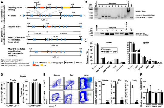 CD18CD11c cKO mice display a DC-specific knockdown of β2 integrins. (A) Schematic overview of the generation of mice with a floxed CD18 exon 3 gene locus and the Cre recombinase-mediated knockout of exon 3. Sequence information of targeting vector B044.2 are given in Figure S1. (B) Examples of PCR-based genotyping of CD18CD11c cKO mice assessing the presence of the floxed versus wild-type (WT) CD18 allele (upper panel) and Cre recombinase expression (lower panel). (C) Frequencies of leukocyte populations in blood (left panel; gating strategy shown in Figure S2) and spleen (right panel; gating strategy as described in [44]) were assessed by flow cytometry (mean ± SEM of 4–6 experiments). (D) Frequencies of β2 integrin α (CD11a and CD11b) and β (CD18) expressing splenic T cells (left panel) and macrophages (MACs) (mean ± SEM of 4 experiments). (E) Left panel: Dot plots show expression of MHCII and CD11c in cells derived from different organs and are representative of 3 experiments. Right panel: Quantification of CD11c-expressing cells in different organs (mean ± SEM of 3 experiments). (F) Relative frequency of splenic DC populations (gating strategy shown in Figure S4), normalized to the respective control (mean ± SEM of 4 experiments). (C,E) Statistical differences versus * CD18fl/fl are indicated (unpaired t-test) (The asterisk denotes statistical differences between the “knockout” and the control group). ** p < 0.01, *** p < 0.001.