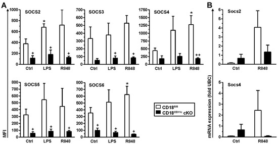 Impaired β2 integrin expression in BMDCs results in attenuated SOCS protein levels. BMDCs (CD18fl/fl and CD18CD11c cKO) were stimulated overnight in parallel with LPS and R848 or were left untreated (Ctrl). (A) On the next day, SOCS protein expression was assessed on cytospins by immunofluorescence. Representative graphs are shown in Figure S5. Data denote SOCS protein expression (mean MFI ± SEM of 3–4 experiments). (B) Expression of SOCS mRNA species was monitored 4 h after onset of stimulation by real-time PCR and is given in relation to the expression of the housekeeping gene UBC (mean ± SEM of 3–4 experiments). (B) Statistical differences versus * corresponding Ctrl and + CD18fl/fl at corresponding conditions are indicated (one-way ANOVA, Tukey test). *,+ p < 0.05, ++ p < 0.01.
