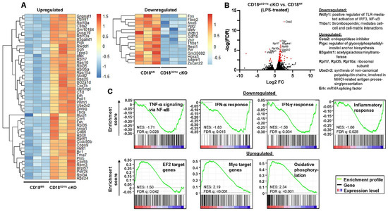 Downregulation of β2 integrins in BMDCs results in attenuated expression of genes associated with inflammatory signaling and upregulation of genes involved in metabolic pathways, as well as transcription factor Myc/EF2 targets. LPS-stimulated BMDCs (CD18fl/fl and CD18CD11c cKO, each n = 3) were subjected to RNA-seq analysis. (A) Heatmap representation of the top 50 significantly upregulated (left panel) and significantly downregulated (right panel) genes in CD18CD11c versus CD18fl/fl BMDCs (hierarchical clustering). The color legend denotes the level of gene expression (low: blue; high: red) and represents z-scores. (B) Volcano plot of all quantified mRNA species. Significantly regulated genes (t-test q-value < 0.05 and log2(fold-change) > 2) are given in red. The top 10 genes are named. (C) Gene set enrichment plots of significantly regulated pathways (FDR adjusted q-values < 0.05). The normalized enrichment score (NES) and FDR q-values are given.