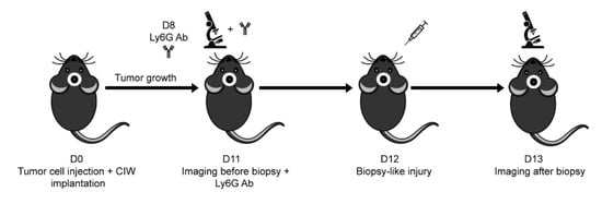 All animal experiments were carried out in accordance with the guidelines of the Animal Welfare Committee of the Royal Netherlands Academy of Arts and Sciences, the Netherlands. The experimental protocols used in this manuscript were approved by the Centrale Commissie Dierproeven (CCD, approval code AVD801002015125, approval date 22 November 2016). C57BL/6 mice (age 8–12 weeks) were used for the experiments. Mice were housed at the animal facility in the Hubrecht Institute and received food and water ad libitum. Implantation of tumor cells, cranial imaging window (CIW) placement, and biopsy-like injury have been described extensively elsewhere [,]. In short, on day 0, mice were sedated, the head was shaved, and an incision was made on the top part of the head. A circular hole was drilled over the right parietal bone and 1 × 105 GL261 H2b-dendra2 glioma cells, suspended in 3 µL PBS, were injected at a depth of 0.5 mm. Subsequently, a chronic CIW was placed. Three mice received intraperitoneal injection of 100 µg Ly6G antibodies (1A8; BioXcell, Lebanon, PA, USA) on days 8 and 11. On day 12, the CIW was replaced and mice received biopsy-like injury. The injury consisted of four needle punctures with a 25G needle in the tumor at a depth of 1 mm. The needle contained fluorescent beads allowing the identification of the biopsy area. On day 13, the mice were sacrificed. Blood was obtained via heart puncture and the tumor was harvested. The experiments were performed in two independent groups. These procedures were performed by the same researcher in the same time-period as control data without Ly6G antibody depletion with biopsy (six mice) and without biopsy (six mice), as previously reported by Alieva et al. [].