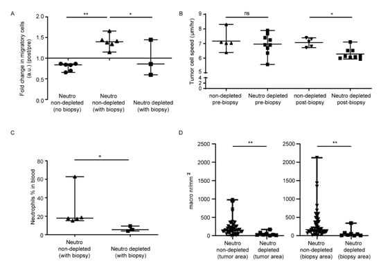 As published previously [], the fold change of migratory tumor cells at day 13 over day 11 decreased if no biopsy was induced. In contrast, the fold change of migratory tumor cells significantly increased after biopsy (Figure 2A,B). In neutrophil-depleted mice, the fold change in migratory cells upon biopsy significantly decreased compared to controls without neutrophil depletion (Figure 2A). Furthermore, the speed of migratory cells was significantly decreased in neutrophil-depleted tumors after biopsy compared to control biopsied mice without neutrophil depletion (Figure 2B and Supplementary Video S1). Of note, we have previously reported that a control IgG did not change GL261 migration or cell division [].