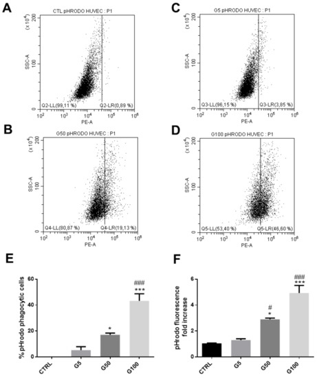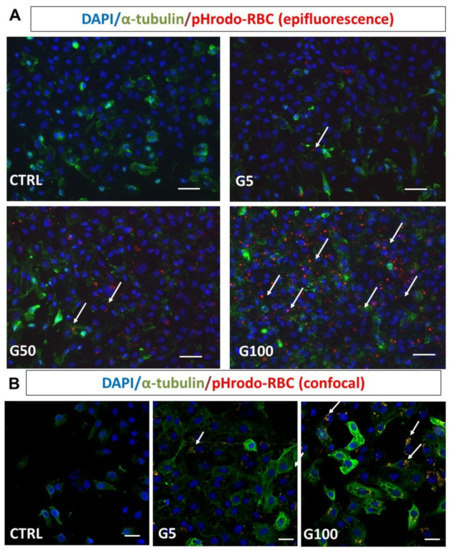 One of the common ways to assess erythrophagocytosis consists of erythrocyte labeling with fluorescent probes such as pHrodo or PKH67 (Turpin, 2022 unpublished manuscript). Erythrocyte samples are resuspended at 20% hematocrit and labeled with the fluorescent markers pHrodo or PKH67, according to the manufacturer’s instructions. For pHrodo, 109 erythrocytes were labeled with 2 µL pHrodo Red succinimidyl ester in a final volume of 1 mL PBS for 60 min at 37 °C. For PKH67, 50 µL of erythrocytes (corresponding to 2.5 × 107 cells) resuspended in 1 mL diluent buffer (supplied in the kit), were mixed to 2 μM PKH67 solution. The mixture was incubated at 37 °C for 10 min. Probe in excess was removed by several washing steps with PBS followed with 10 min centrifugation at 2000× g. Labeled erythrocytes were suspended with PBS at a final 20% of hematocrit prior to direct incubation with cultured endothelial cells for 6 h or 12 h. Endothelial cells treated in the same manner, but with unlabeled erythrocytes, were used as negative controls. After incubation and an intensive cell washing (three times with PBS) to get rid of non-phagocytosed erythrocytes, cells were subjected to flow-cytometry analysis, epi-fluorescence microscopy (Nikon Eclipse 80i) or confocal microscopy (Nikon Eclipse Ti2).