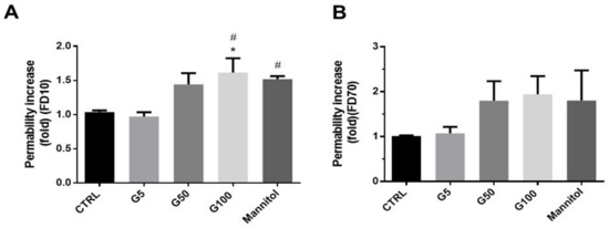 For endothelium permeability determination, HUVECs (3 × 105) were seeded on Millicell® 12-well hanging cell culture inserts (PET membrane with 0.4 μm pores)(Millipore, Burlington, MA, USA). Confluent cells were loaded with isothiocyanate (FITC)-labeled dextran (4 kDa and 70 kDa), prior to and during cell incubation in the absence (control) or the presence of erythrocytes (18.6 × 106 cell/cm2). Mannitol hyperosmotic solution (1.4 M) was used as a positive control for endothelial barrier opening. After 6 h of incubation and three successive washes with PBS, 800 μL of 10 kDa or 70 kDa dextran solutions (prepared at 0.385 mg/mL in serum-free RPMI 1640 (without phenol red)) were added on cells (apical chamber). The basolateral chamber was composed of serum-free RPMI 1640 (without dextran at the beginning of the test). Medium from the basolateral chamber was collected and replenished with fresh medium every 15 min for 1 h. The concentrations of FITC-dextran in medium from the basolateral chamber were determined by fluorescence measurements in collected samples with a microplate reader (Fluostar Optima; emission wavelength: 485 nm, excitation wavelength: 520 nm). The concentrations of FITC-dextran in medium from the basolateral chamber were calculated with respect to the FITC-dextran calibration curve (calibration range: 0.001–1 mg/mL). Results were expressed as a permeability increase calculated with the formula Ps/Pctrl where Ps and Pctrl are the slope of the curve corresponding to cumulated FITC-dextran concentration in medium against time for sample and control, respectively.