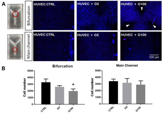 50]. To demonstrate the possible influence of hemodynamics, a channel mimicking a Y-shape bifurcation was designed. Compared to the main straight channel, bifurcations promote higher shear stress changes that can impact endothelial cell response [