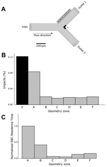 53]. To quantify the effects of circulating erythrocytes on the endothelial cells at the walls of the channel, in terms of number of impacts and time of residence, a numerical simulation approach was implemented. This simulation in silico reproduced the conditions of our in vitro flow assay. The results were consistent with fluid behavior at the bifurcations. These types of geometries are characterized by the presence of low-velocity zones at the outer wall [