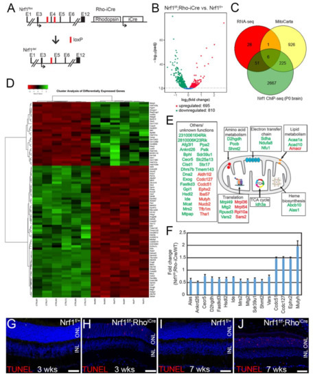 - Kiyama, T.; Chen, C.K.; Wang, S.W.; Pan, P.; Ju, Z.; Wang, J.; Takada, S.; Klein, W.H.; Mao, C.A. Essential roles of mitochondrial biogenesis regulator Nrf1 in retinal development and homeostasis. Mol. Neurodegener. 2018, 13, 56. [Google Scholar] [CrossRef]