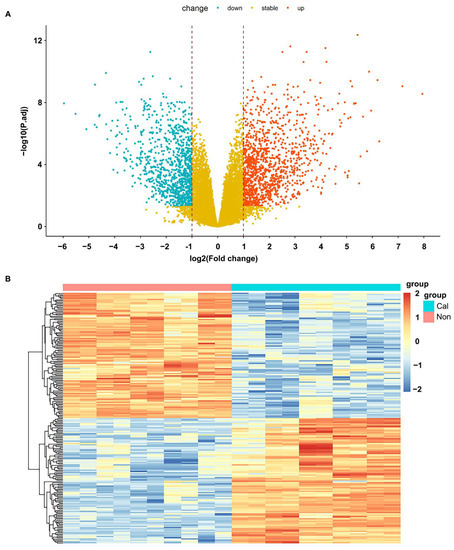 Differentially expressed genes in calcified and noncalcified aortic valve tissue. (A) The volcano plot and (B) hierarchical cluster heat map of differentially expressed genes.
