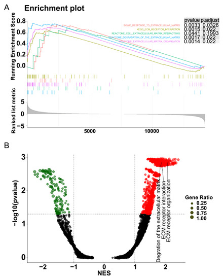 Gene set enrichment analysis (GSEA) of the whole gene expression of the calcified and noncalcified aortic valve tissues. (A) Extracellular matrix (ECM) receptor interaction, cell ECM interactions, degradation of the ECM and ECM organization were significantly enriched. (B) The volcano plot of GSEA revealed degradation of ECM, ECM receptor interaction and ECM organization were significantly enriched.