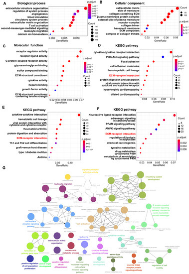 Gene ontology and Kyoto Encyclopedia of Genes and Genomes (KEGG) enrichment of differentially expressed genes. (A) Biological process revealed extracellular structure organization and extracellular matrix (ECM) organization were enriched. (B) ECM-related cellular components were significant enriched. (C) Among molecular function, the receptor regulator activity, receptor ligand activity, ECM structural constituent, and ECM structural conferring tensile strength were enriched. KEGG enrichment analysis revealed the ECM-receptor interaction pathway was significant enriched in all 1831 DEmRNAs (D), 1114 upregulated DEmRNAs (E) and 717 downregulated DEmRNAs (F). (G) The ClueGO plug-in was used to investigate the interaction networks of enriched biological processes.