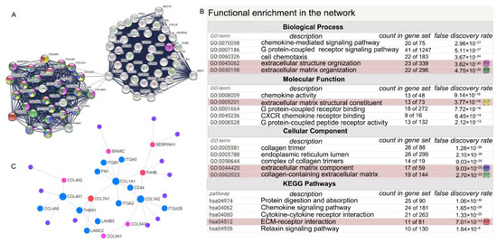 Functional enrichment of the gene cluster1 with the highest score of MCODE. (A) STRING reveals the interaction of genes in cluster 1. (B) Functional enrichment analyses of genes in cluster 1. (C) Network Analyst is used to validate the enrichment results and genes involved in extracellular matrix (ECM)-receptor interaction are noted in blue. The red nodes indicate protein digestion and absorption pathway and the violet nodes represent the genes involved in cytokine-cytokine receptor interaction.