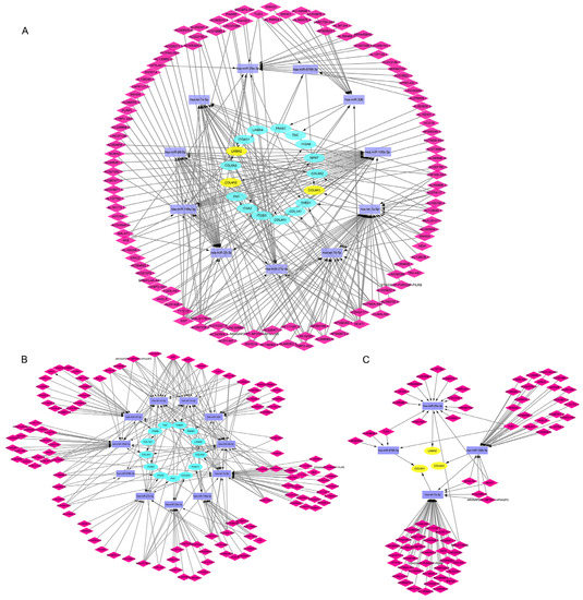 The corresponding lncRNAs of hub miRNAs were predicted with ENCORI software [26]. The selection conditions were set the highest reliability (very high stringency of CLIP data ≥ 5) and 113 lncRNAs were predicted to interact with the hub miRNAs. The number of CLIP sites and target sequence in each of the lncRNA-miRNA relations within the ENCORI databases are shown in Supplementary Table S5. The lncRNA-miRNA-mRNA ceRNA network was constructed with Cytoscape as shown in Figure 6A. In order to obtained more detailed biological insights, we separately to analyze that mRNAs were up or down-regulated networks in CAVD (Figure 6B,C).