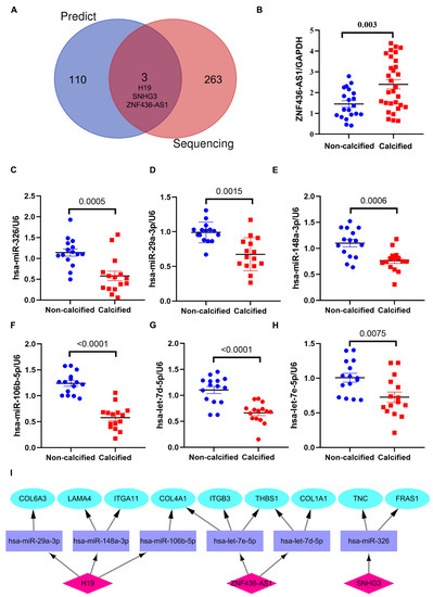 To verify the potential 113 lncRNAs in the ceRNA network, we first analyzed the DElncRNAs in the GSE199718 and screened out that 152 lncRNAs were upregulated and 114 lncRNAs were significantly downregulated in CAVD with the criteria: Log2 fold change > 0.6 and adjusted p value < 0.05. We found 3 DElncRNAs in the ceRNA network: H19, SNHG3 and ZNF436-AS1 (Figure 7A). H19 was reported that DNA hypomethylation in the promoter region of H19 during CAVD leads to an overexpression of this lncRNA, resulting in promoting osteogenic transition of VICs [6]. Then, we also verified these 3 lncRNAs in 50 human samples (30 cases of calcified and 20 noncalcified aortic valve tissues) using RT-qPCR and the expression of H19 (p = 0.0001), SNHG3 (p < 0.0001) and ZNF436-AS1 (p = 0.003) (Figure 7B) in calcified aortic valve tissues were significantly higher than that of non-calcified control. Our previous research found that SNHG3 was increased in calcified aortic valves, which prompted osteogenic differentiation of VICs via upregulation of the BMP2 pathway [27]. Additionally, we also detected the expression of predicted miRNAs regulated by validated lncRNAs (H19, SNHG3 and ZNF436-AS1) in human aortic valves using RT-qPCR. We also found that has-miR-326 (p = 0.0005), has-miR-29a-3p (p = 0.0002), has-miR-148a-3p (p = 0.0006), has-miR-106b-5p (p<0.0001), has-let-7d-5p (p < 0.0001), and has-let-7e-5p (p = 0.0075) were significantly down-regulated in calcified aortic valve tissues (Figure 6C–H). Thus, we constructed a competitive endogenous network including validated up-regulated lncRNAs (H19, SNHG3 and ZNF436-AS1), down-regulated miRNAs (has-miR-326, has-miR-29a-3p, has-miR-148a-3p, has-miR-106b-5p, has-let-7d-5p, has-let-7e-5p) and up-regulated mRNAs (COL4A1, COL1A1, COL6A3, THBS1, ITGB3, LAMA4, ITGA11, FRAS1, TNC) in the calcified aortic valves (Figure 6I).