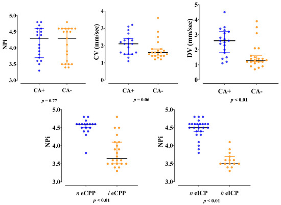 Differences in Neurological Pupil Index (NPi), constriction velocity (CV) and dilation velocity (DV) between patients with impaired (CA−) and intact (CA+) cerebral autoregulation; differences in Neurological Pupil Index (NPi) between patients with normal (n eCPP) and low (l eCPP) cerebral perfusion pressure or between those with normal (n eICP) and high (h eICP) intracranial pressure.